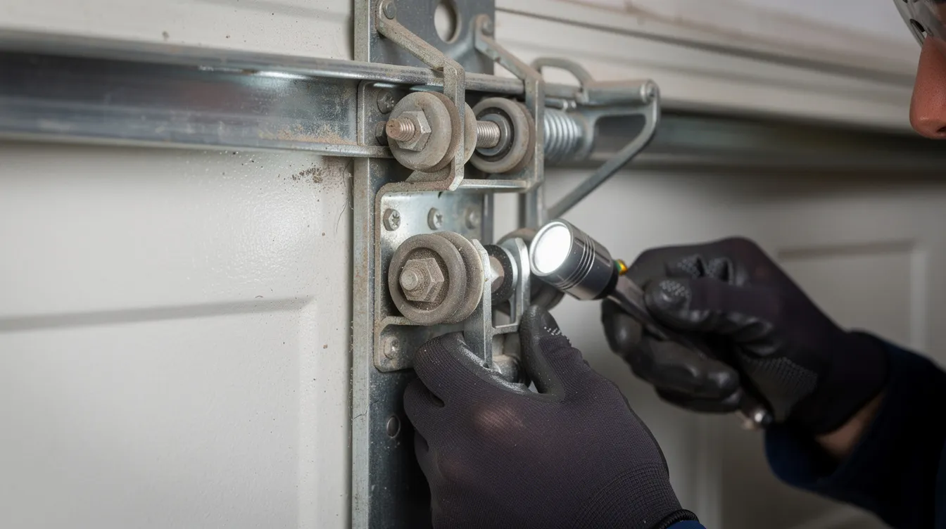 Inspect hinges, roller brackets, and track brackets with the door closed. Look for visibly loose or missing fasteners. Use a basic wrench to snug clearly loose hinge or track bolts, avoiding brackets connected to springs or cables. Stop if you encounter rusted, stripped, or severely bent hardware. Check opener mounting bolts at the ceiling for looseness that causes rattle.
