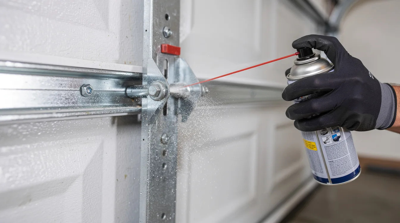 Clean track interiors with a dry cloth to remove dust and cobwebs—don’t use grease inside tracks. Apply a small amount of silicone or lithium grease to roller bearings, hinge pins, and spring coils, then cycle the door to distribute. Use cardboard as a shield to prevent over-spray on panels or vehicles. Check your opener manual; some newer belt systems shouldn’t be lubricated.